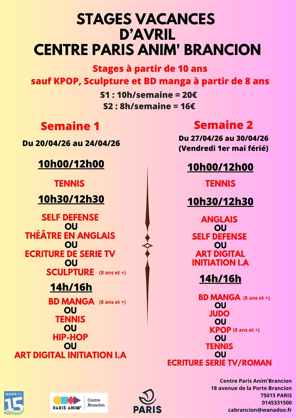 Stages pour adolescents au centre Brancion PARIS ANIM' 15 pour les vacances d'e Pâques 2026 - Self Defense, tennis, ecriture TV, hip-hop, BD Manga, art digital et IA